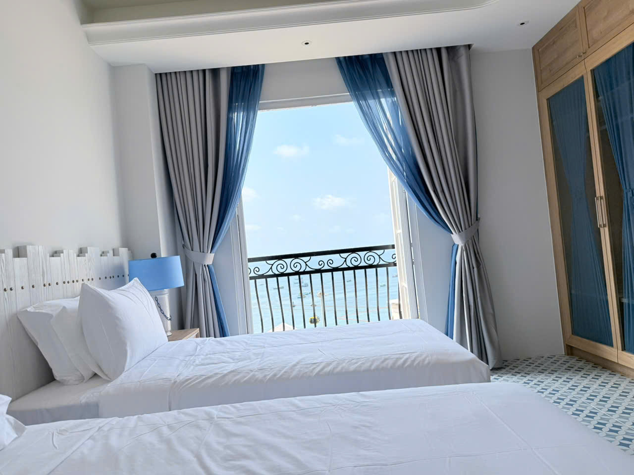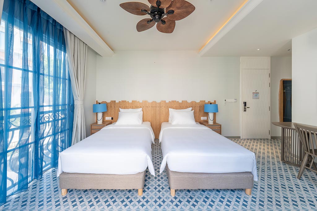 Deluxe room facing the street, with balcony offering partial sea view and fireworks at night. One double bed or two single beds, suitable for 2 guests. No kitchen.