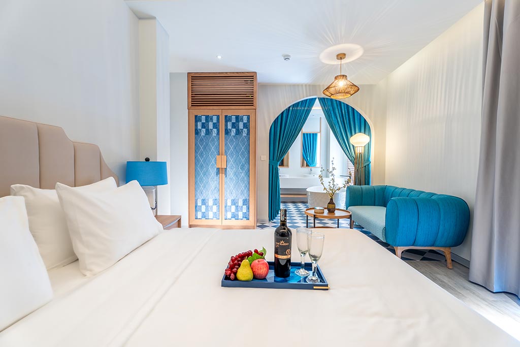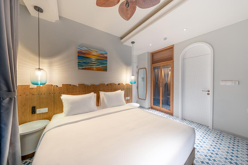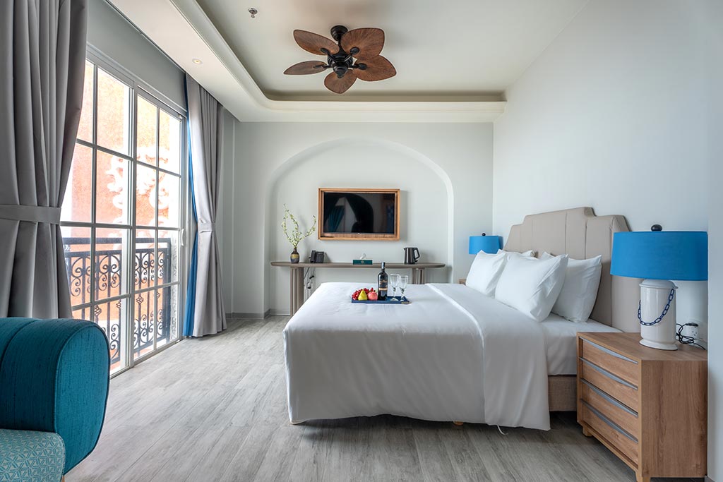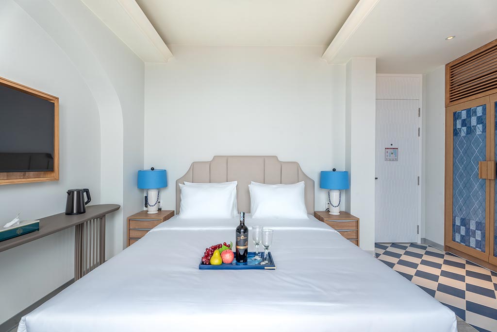 Deluxe room facing the street, with balcony offering partial sea view and fireworks at night. One double bed or two single beds, suitable for 2 guests. No kitchen.