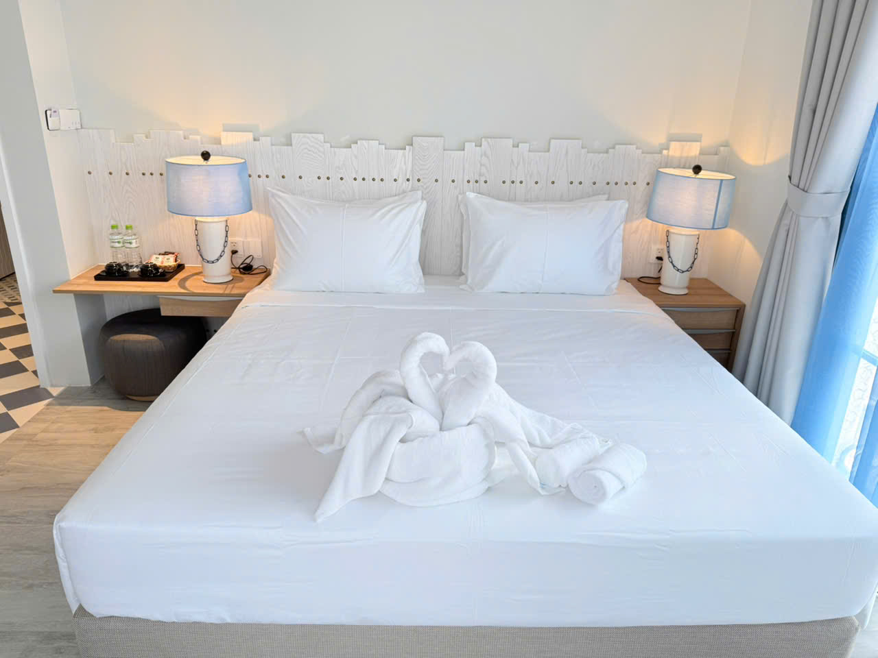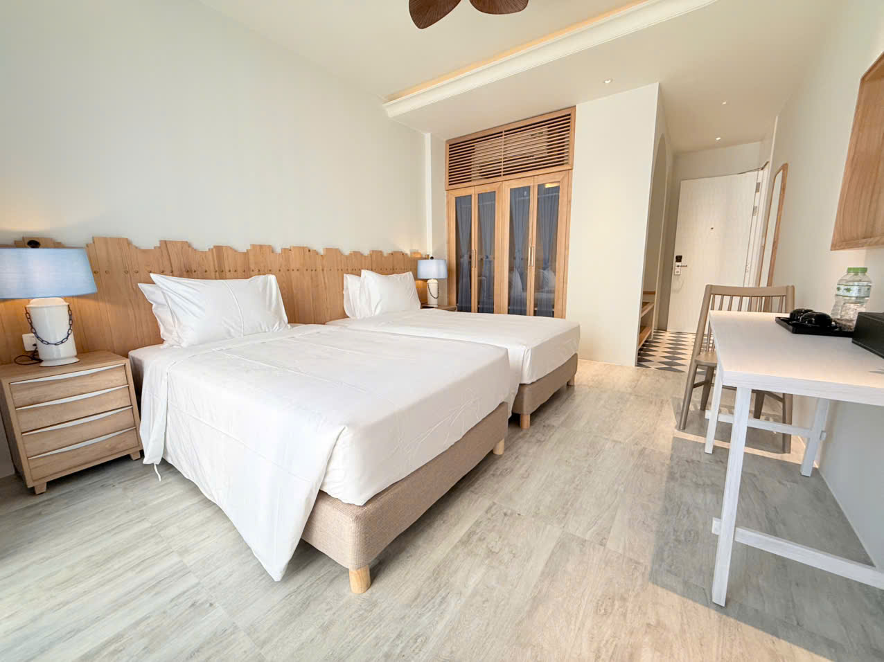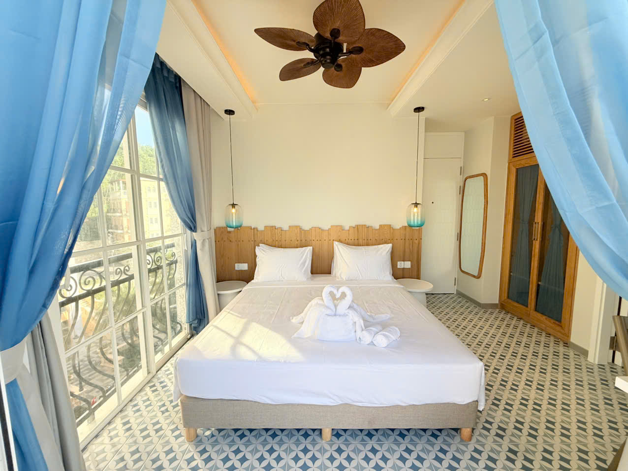 Deluxe room facing the street, with balcony offering partial sea view and fireworks at night. One double bed or two single beds, suitable for 2 guests. No kitchen.