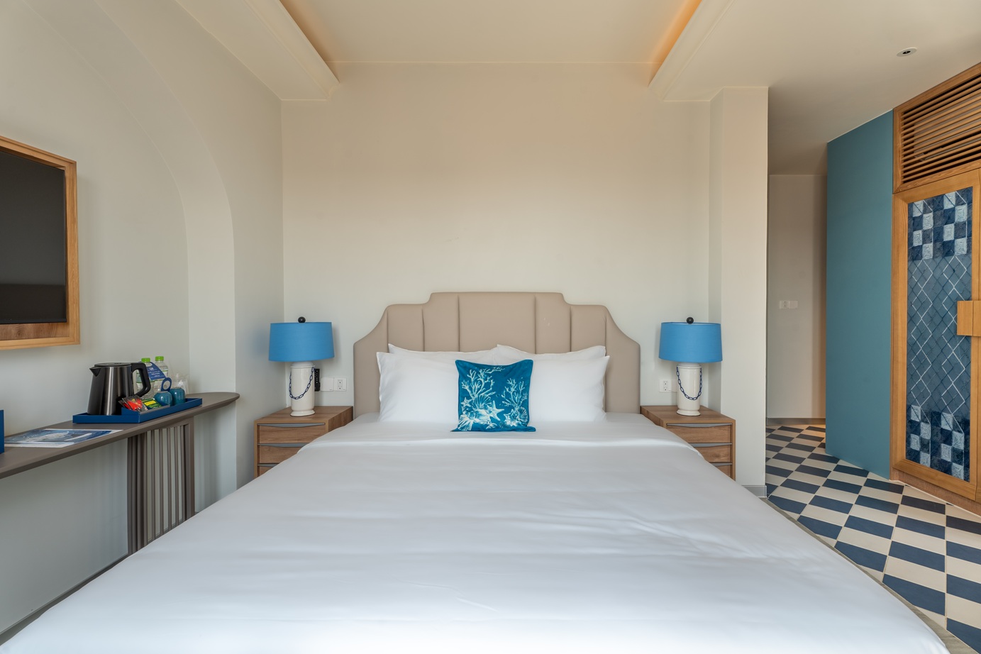 Deluxe room with sea view and private balcony, featuring one double bed or two single beds. Modern design with standard hotel amenities, perfect for 2 guests. No kitchen.