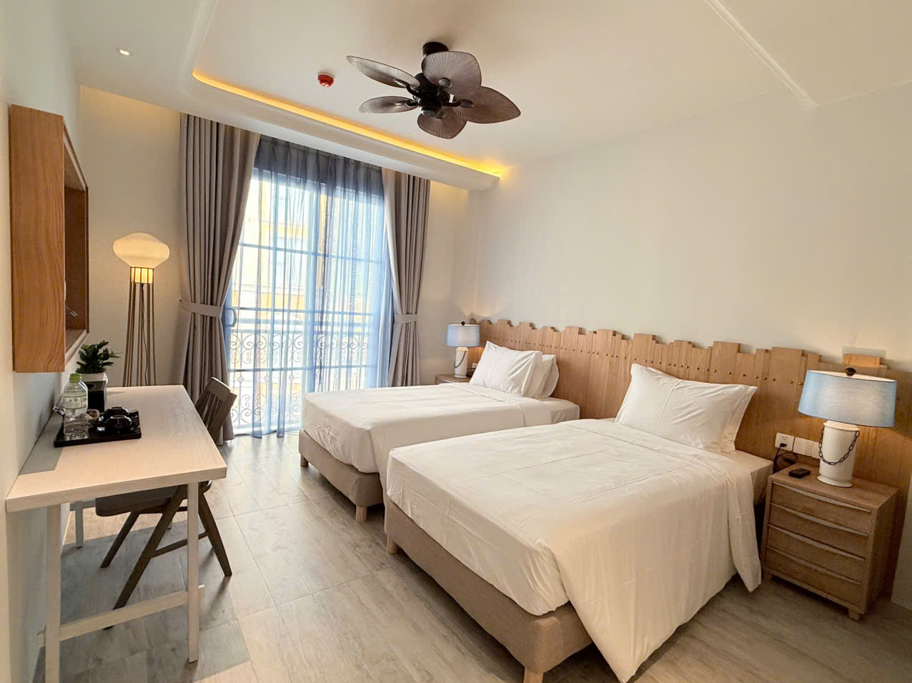 Deluxe room facing the street, with balcony offering partial sea view and fireworks at night. One double bed or two single beds, suitable for 2 guests. No kitchen.