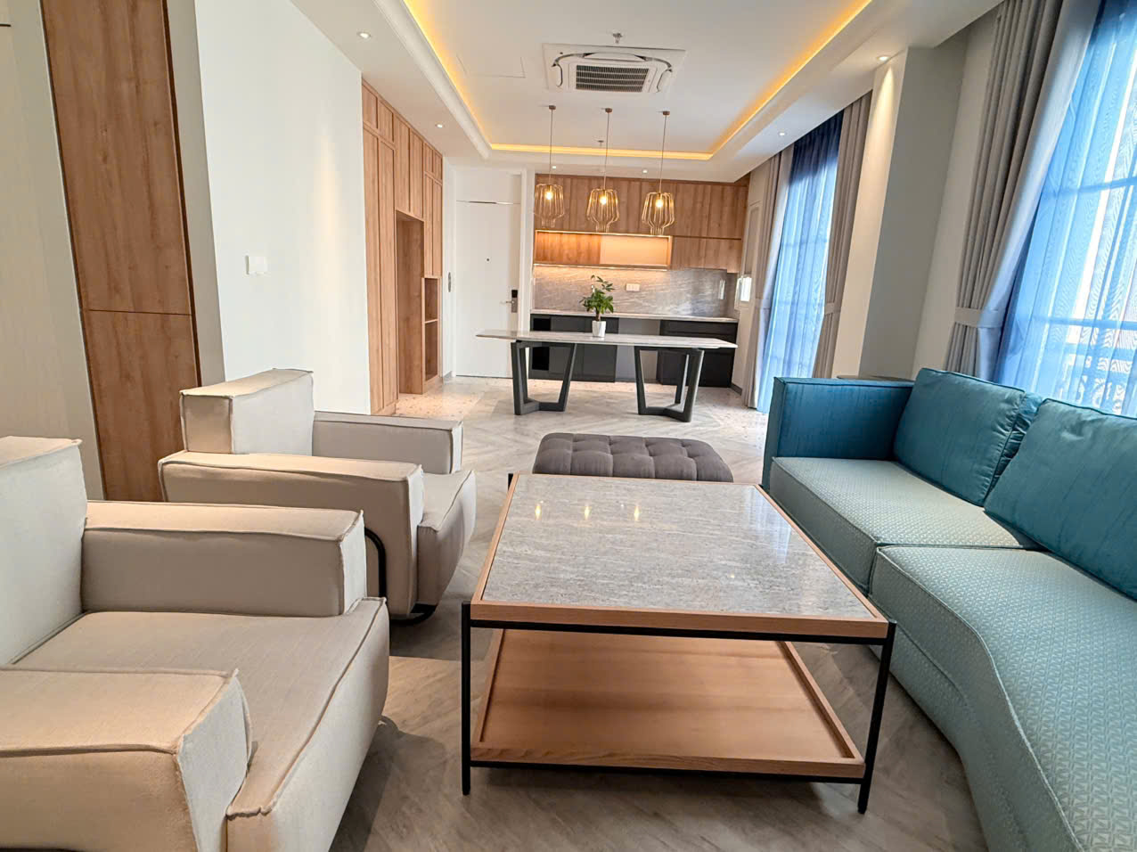 Combined 5-bedroom hotel apartment with very spacious living room and kitchen, 6 bathrooms, panoramic views of sea, street, and mountains. Perfect for extended families or large groups.