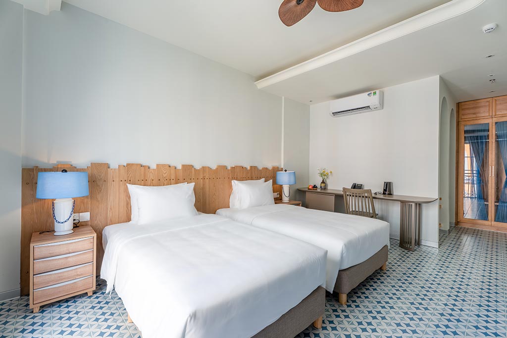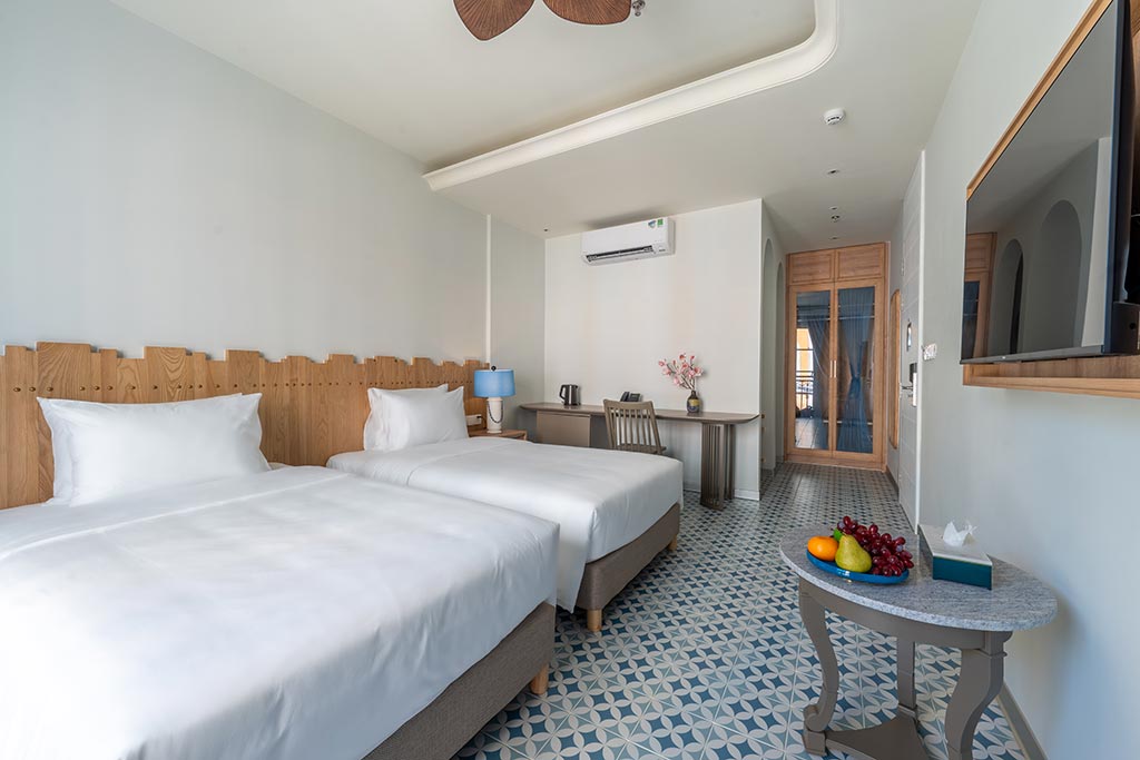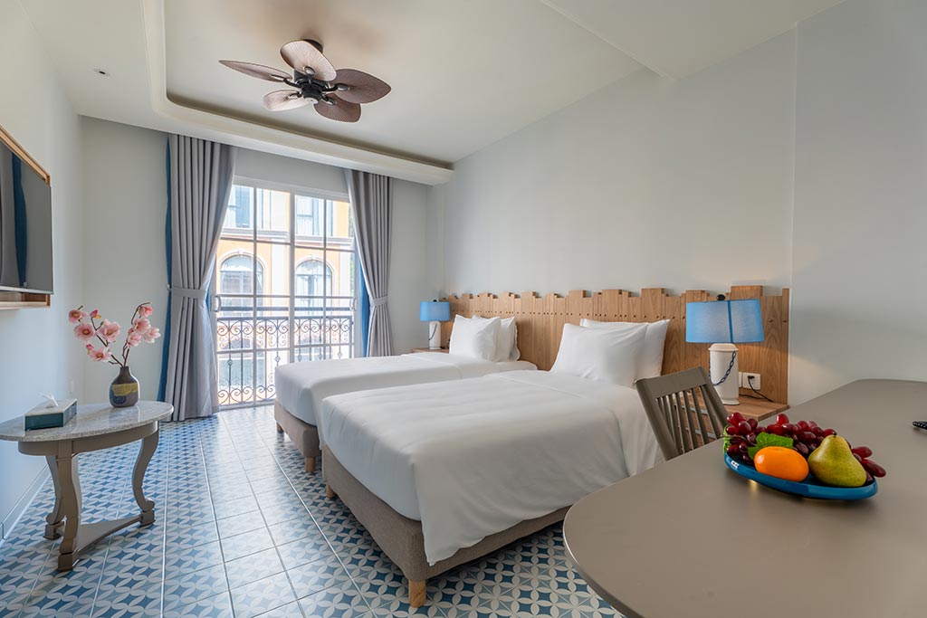 Deluxe room facing the street, with balcony offering partial sea view and fireworks at night. One double bed or two single beds, suitable for 2 guests. No kitchen.