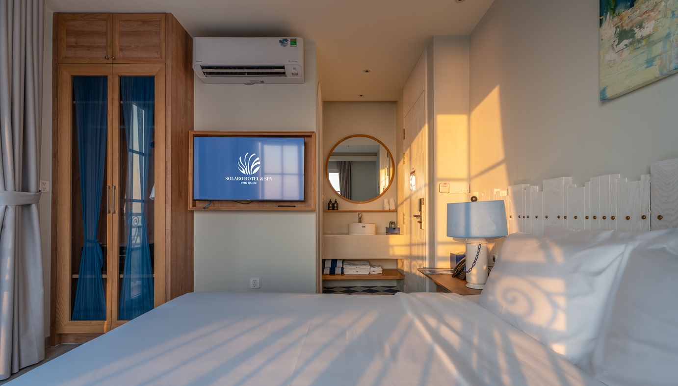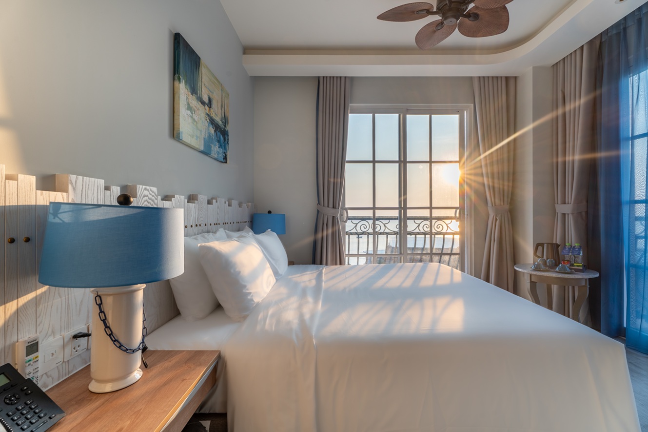 Deluxe room with sea view and private balcony, featuring one double bed or two single beds. Modern design with standard hotel amenities, perfect for 2 guests. No kitchen.