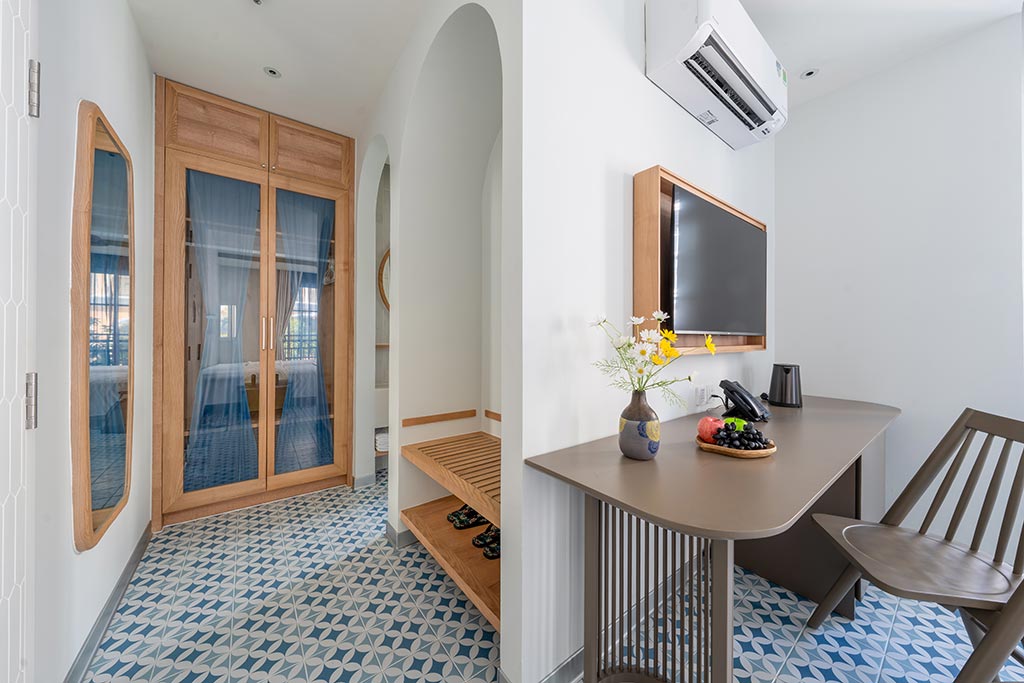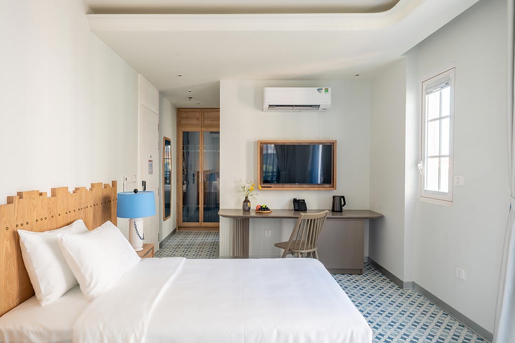 Deluxe room facing the street, with balcony offering partial sea view and fireworks at night. One double bed or two single beds, suitable for 2 guests. No kitchen.