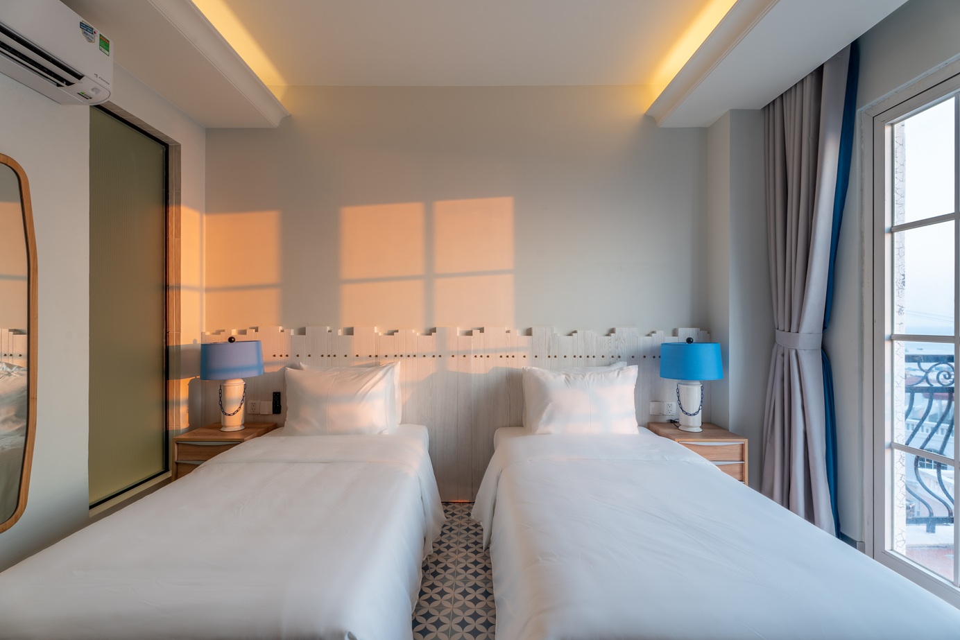 Deluxe room with sea view and private balcony, featuring one double bed or two single beds. Modern design with standard hotel amenities, perfect for 2 guests. No kitchen.