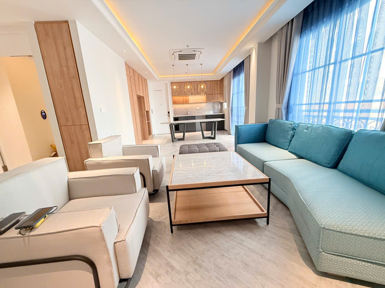 Three-bedroom hotel apartment with spacious living room and kitchen. Panoramic views of sea, street, and mountains. 4 bathrooms. Ideal for large families or groups.