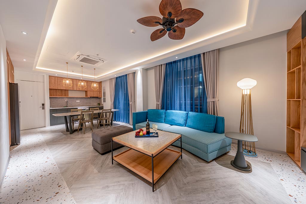 Two-bedroom hotel apartment with sea view, private living area and kitchen. Each bedroom has its own balcony. Suitable for families or groups of up to 4 guests.