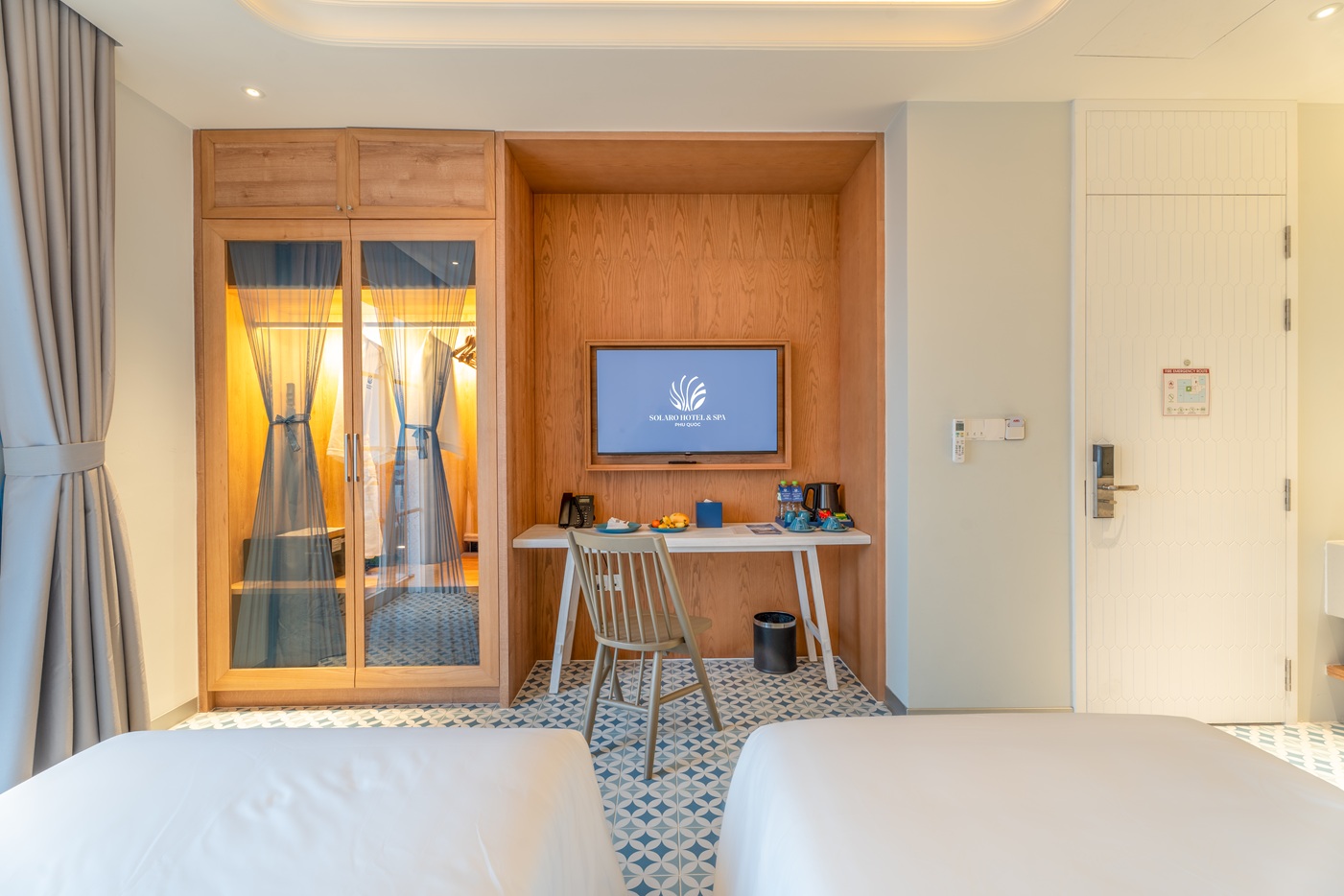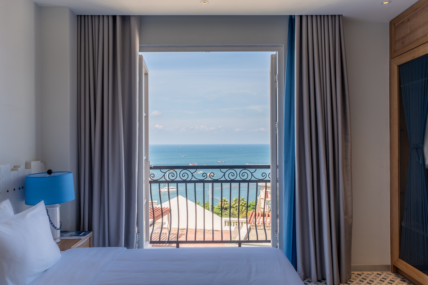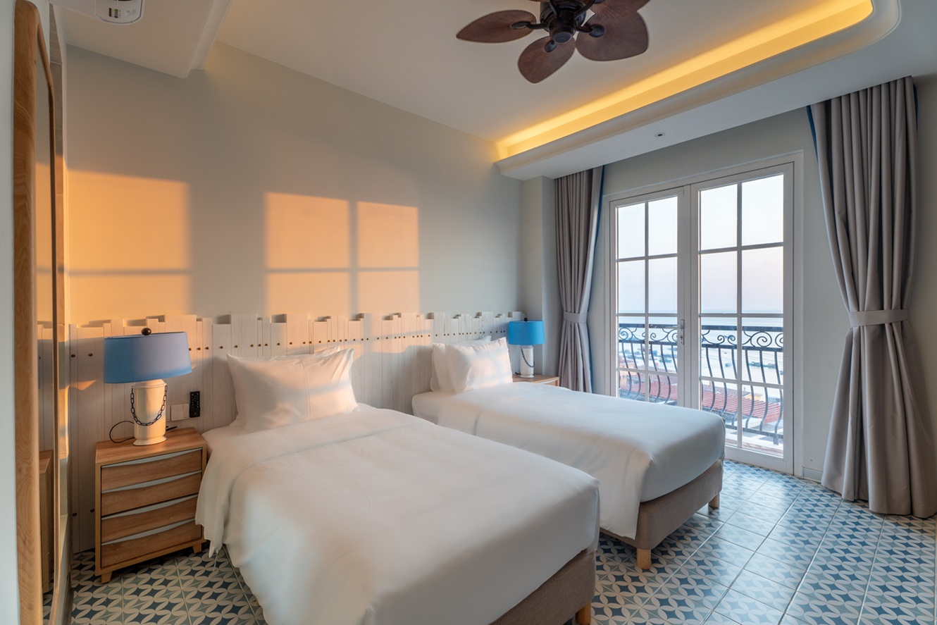 Deluxe room with sea view and private balcony, featuring one double bed or two single beds. Modern design with standard hotel amenities, perfect for 2 guests. No kitchen.